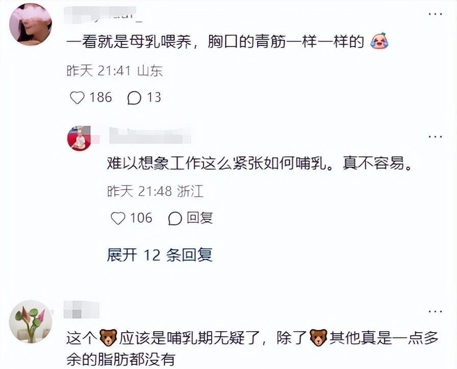 也有观众表达心疼:“正在哺乳期就这么高强度开工,看着身材确实紧致,但面色隐约透出一丝倦意,真是拼尽全力了。”