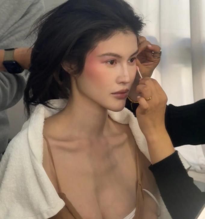 妆容相较看展时更为考究:眉毛勾勒成自然野生眉形,眼尾加深轮廓增强眼神锐度,增添几分干练锋芒;唇色换为更具活力的豆沙红色系,既保持亲和力又彰显专业态度。