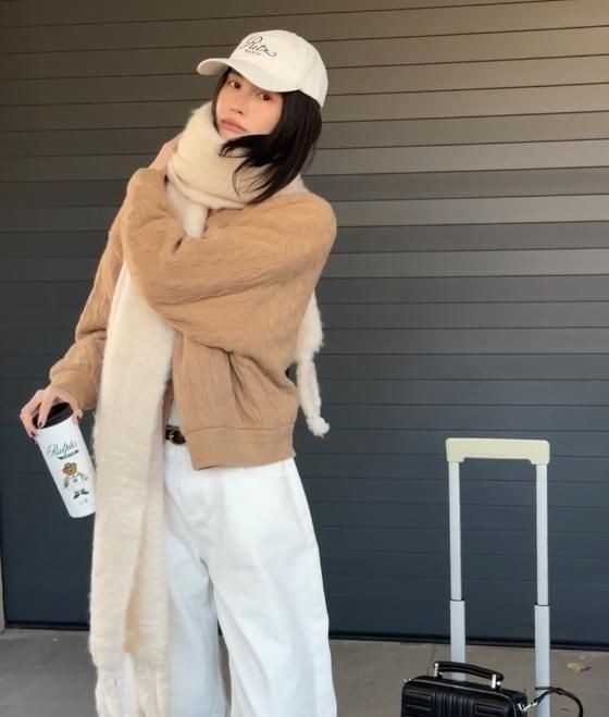 内搭的浅杏色针织衫质地柔软亲肤,与外层硬朗轮廓形成刚柔并济的视觉对比。