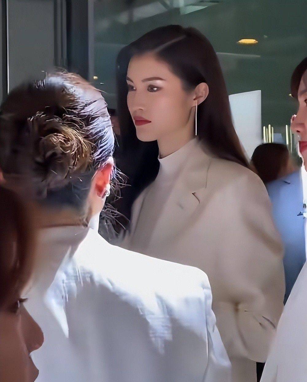画面中的她身着一袭奶油白色调的宽肩西装,内搭浅杏色亲肤针织上衣,脚踩裸色调尖头细跟鞋,整体身形依旧延续了她一贯的高挑纤细风格,仿佛生育过程从未在她的体态上留下任何印记。